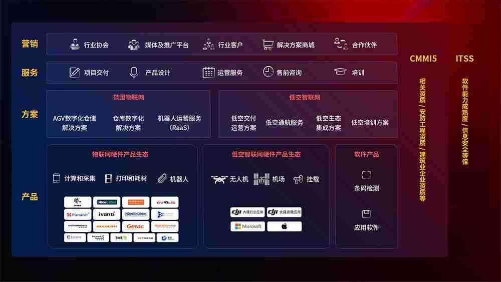 聚合国内外先进的物联网硬件产品品牌,,,,聚焦数字化仓储、、机器人运营、、、、低空智联网等领域,,,共同打造适合客户业务场景的解决方案并提供交付服务